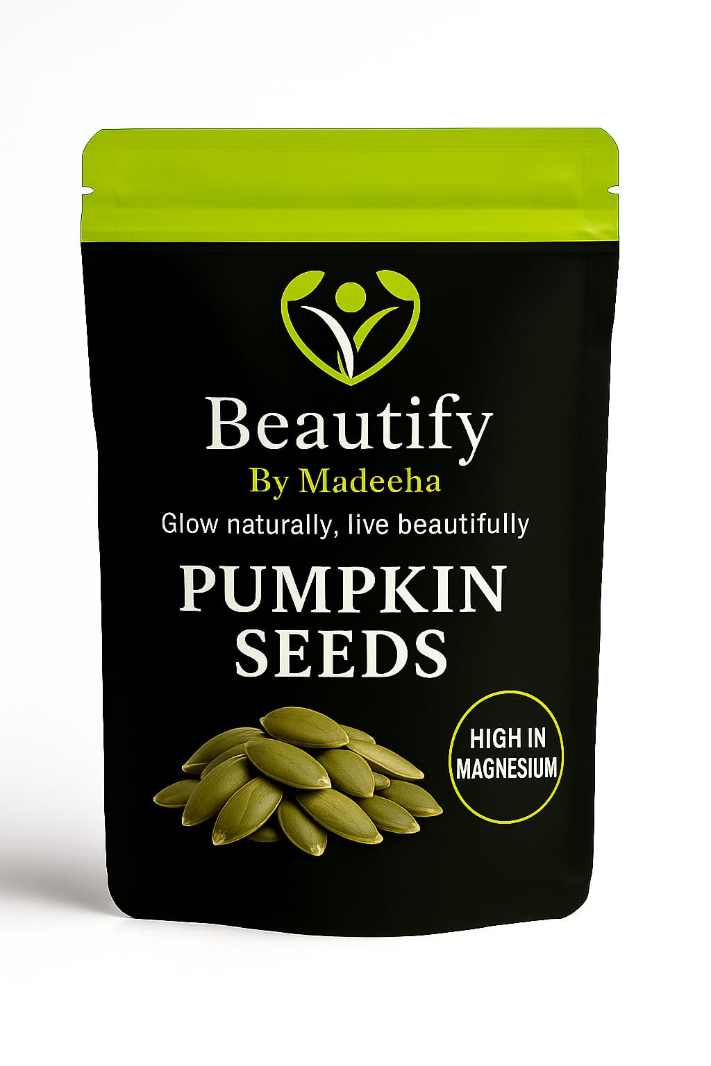 Boost your health and beauty naturally with Beautify By Madeeha Pumpkin Seeds – a delicious, nutrient-packed superfood snack. Sourced from premium quality pumpkins, these organic, non-GMO pumpkin seeds are rich in magnesium, zinc, and healthy fats, making them perfect for supporting glowing skin, strong hair, and overall wellness.